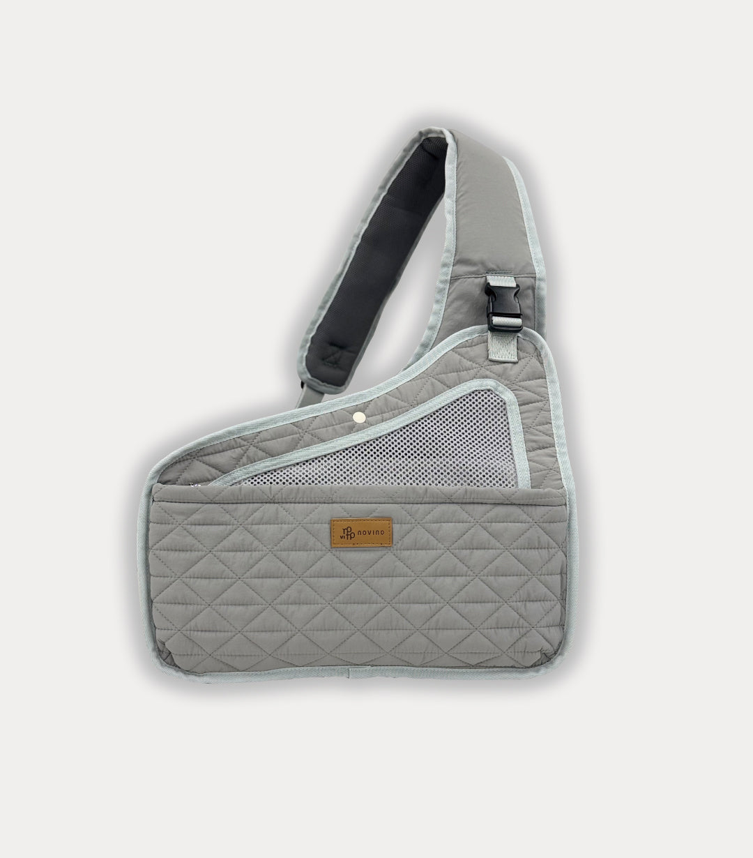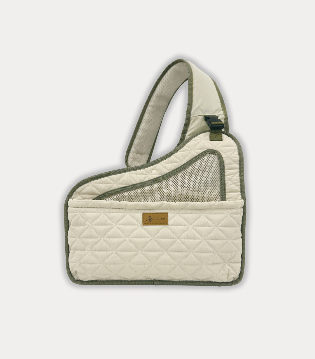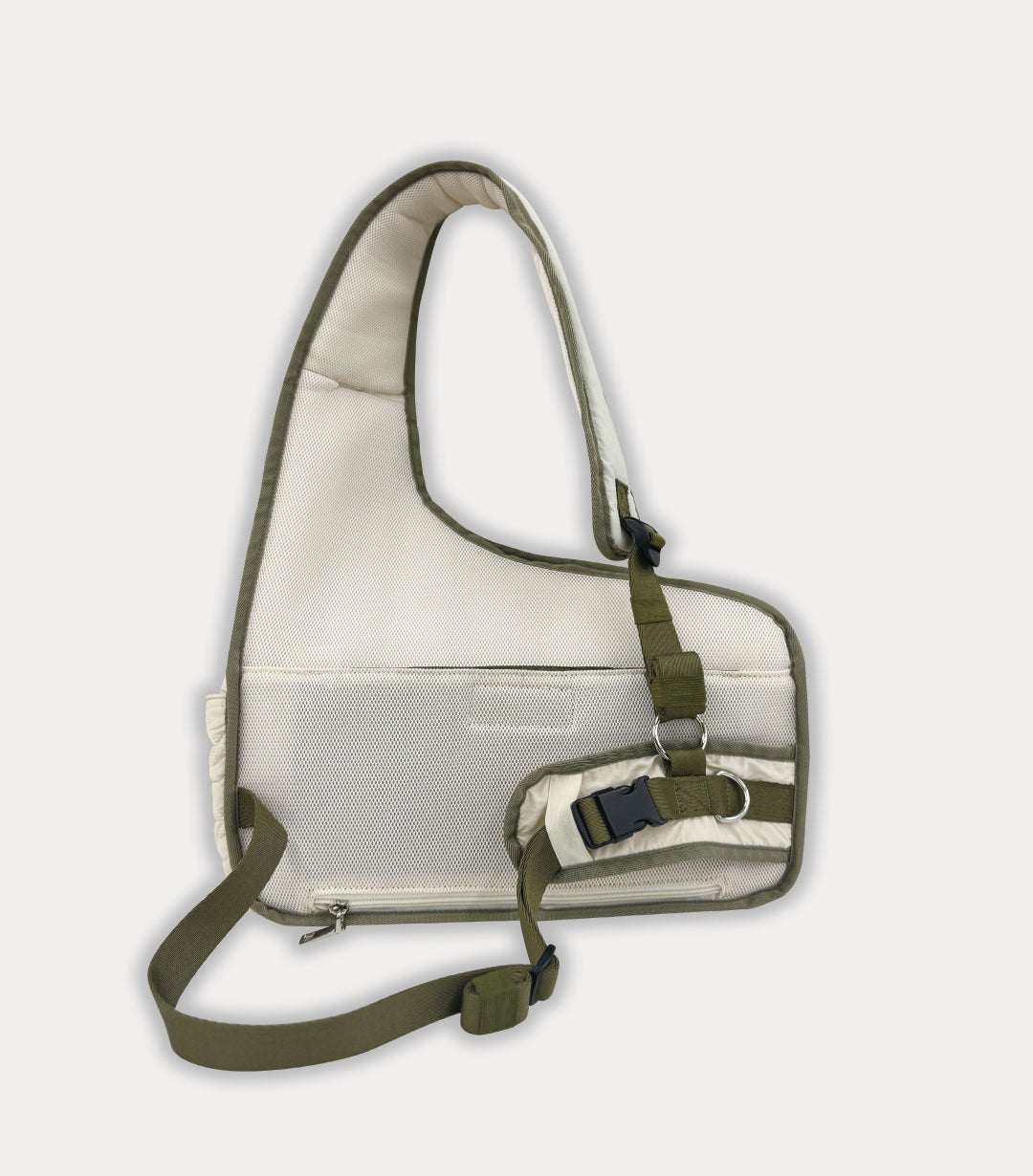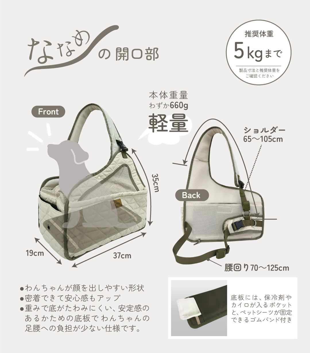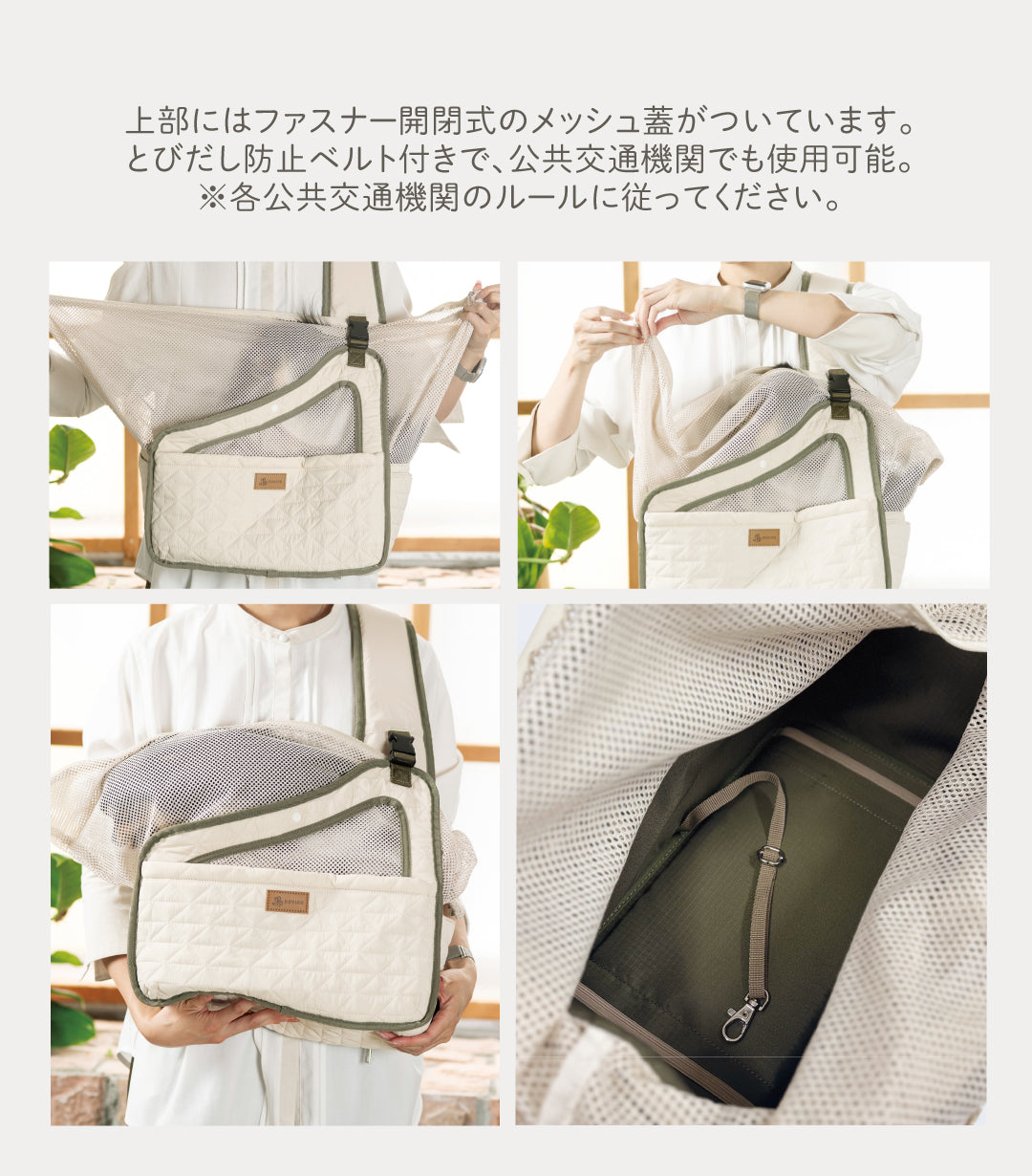 最近では、赤ちゃんの抱っこ紐のような両肩掛けタイプも登場していますが、私たちはあえて斜め掛けスタイルを採用しております。愛犬の出入りのしやすさと、スタイリッシュな見た目を両立させました。