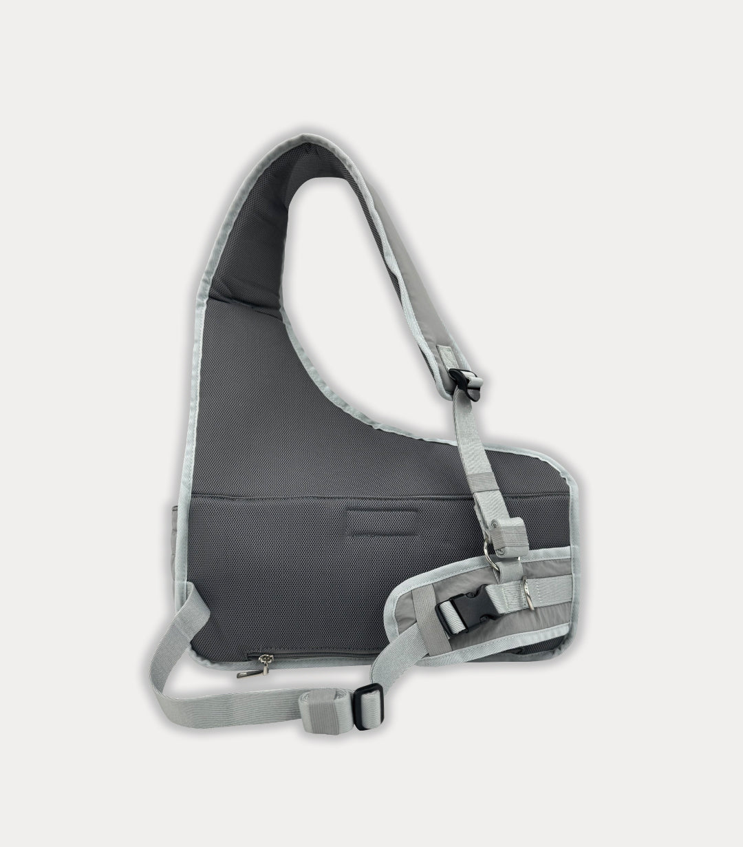 ・最大の特徴は、従来のスリングバッグが抱える課題を解決した構造です。一般的なスリングバッグは底板がなく、密着感はあるものの愛犬の足への負担が大きく、オーナーの肩への負荷も気になるものでした。底板を採用したことにより愛犬が安定して座れる構造となり、安定感から来る安心と快適さで愛犬も落ち着いて過ごせます。
