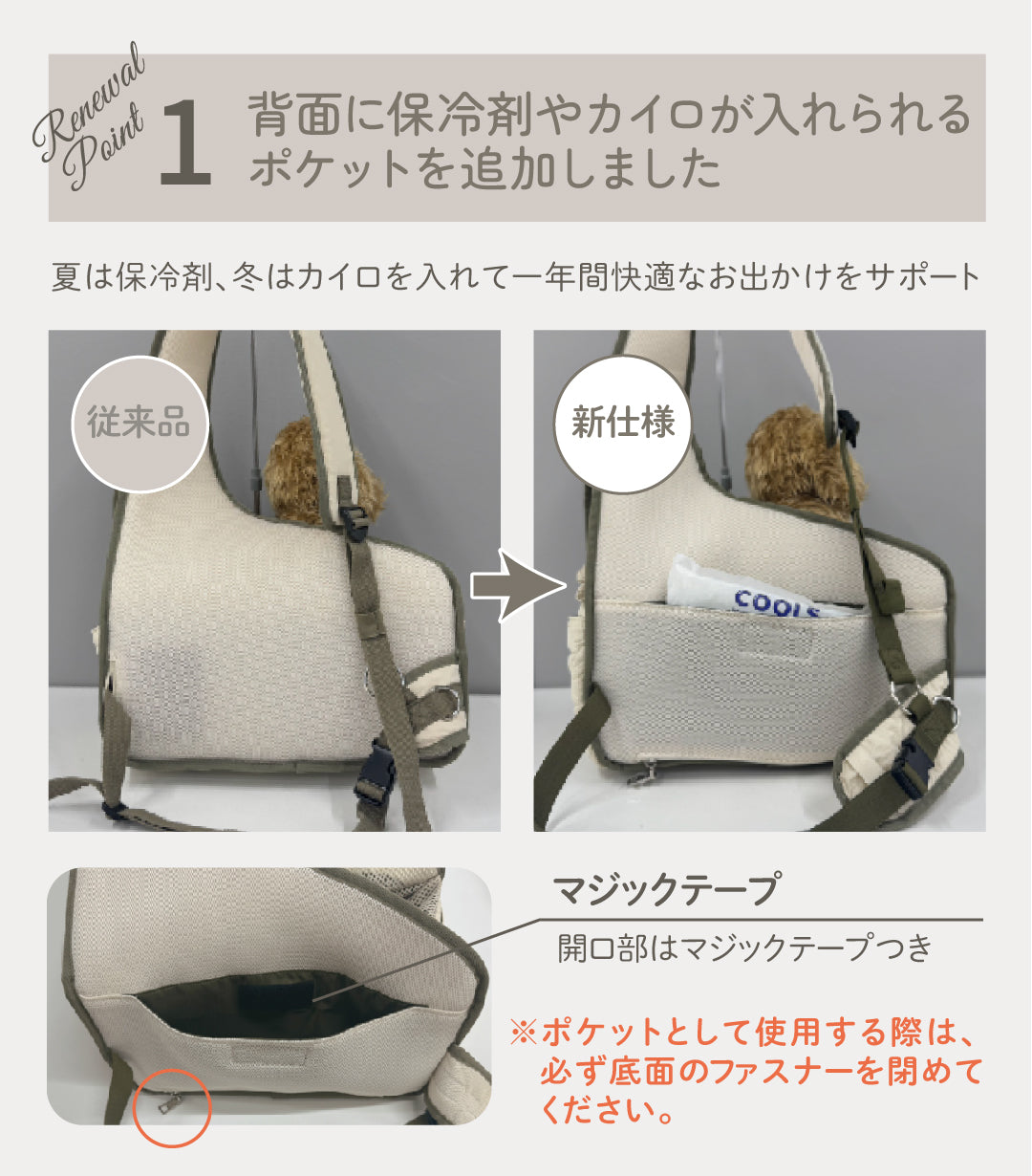 底板はお掃除が簡単にできるように取り外し可能です。ペットシート固定用のコールゴム付きで、内ポケットには保温カイロや冷却材を入れることができ、季節を問わず快適にお使いいただけます。