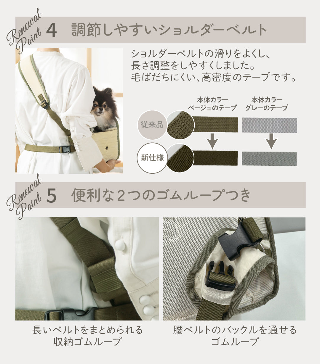 底板の採用と腰ベルトの追加により、愛犬とオーナー双方の負担を軽減。同時に、従来のスリングの特長である密着感や、目があう安心感のあるフェイス位置(愛犬のお顔を乗せる部分)はそのままに、より快適な構造へと進化させました。