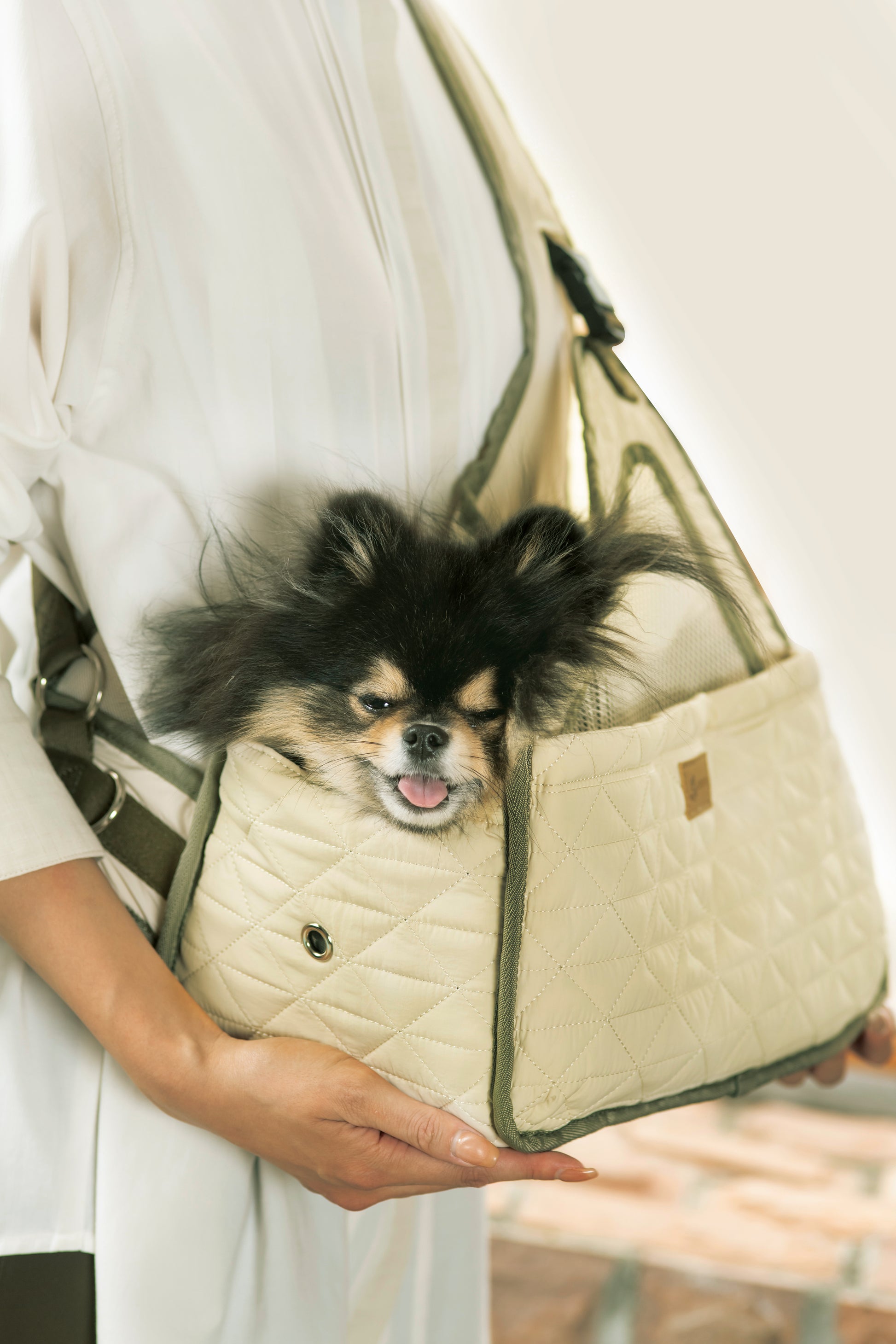 ・対象は~5kgの小型犬です。ベージュとグレーの2色展開。電車やバスでの移動、ドッグランやカフェへのお出かけなど、公共の場所でも気兼ねなく使用できます。また、ご近所のお散歩にも最適です。